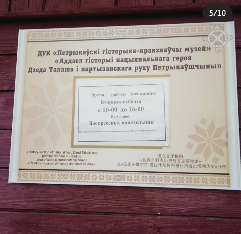 Мы посетили дом-музей Деда Талаша! Отдел истории национального героя Деда Талаша и партизанского движения на Петриковщине посвящён деду Талашу, расположен в 9 километрах от города Петрикова в деревне Новоселки, где жил прославленный партизан. Музей показывает реконструированную усадьбу семьи Талашей. Дед Талаш прославился своей активной партизанской деятельностью. Еще во времена советско-польской войны 1919-1921 года, на тот момент ему было 75 лет, он участвовал в боевых действиях на стороне Красной Армии. В возрасте ста лет он активно боролся против немецко-фашистских захватчиков. Дед Талаш всю жизнь прожил в деревне Новоселки Петриковского района.Отдел включает в себя малую хату, который построен по макету бывшего дома деда Талаша, сожжённого белополяками в гражданскую войну, второй отреставрированный дом, построенный Талашом и его сыновьями после гражданской войны. Здесь можно увидеть сарай, в котором содержались домашние животные, погреб и колодец. Экспозиция «Крестьянская изба к. ХIХ – нач. ХХ вв.» показывает этнографию и быт крестьян. В экспозиции находятся деревянное ведро, длинная крестьянская «канапа», стол, за которым сидел Талаш с сыновьями за обедом или ужином. Гончарные и бондарные изделия, предметы и орудия труда.Там же находится самовар, на печи дежа, в котором замешивали тесто. В «сенцах» стоит Талашов сундук для белья, ткацкий станок, жернова, которыми мололи зерно, здесь же пеньковая сеть деда и др. Также в витринах расположены личные вещи самого деда Талаша и его семьи, свидетельства, оставшиеся от партизанских отрядов и подпольных организаций. Среди них – переписки, фотографии, личные свидетельства, открытки, автобиографии. Очень важно было для нас посетить этот дом-музей, чтобы понять какие настоящие герои нашей страны! Уважаемый человек, живший в бедноте, имеющий домик 3/4 в Полесской глубинке, но имеющий столько мужества и достоинства. Гордимся героями нашей страны, спасибо за такую шикарную экскурсию! Дом-музей Деда Талаша на Яндекс картах