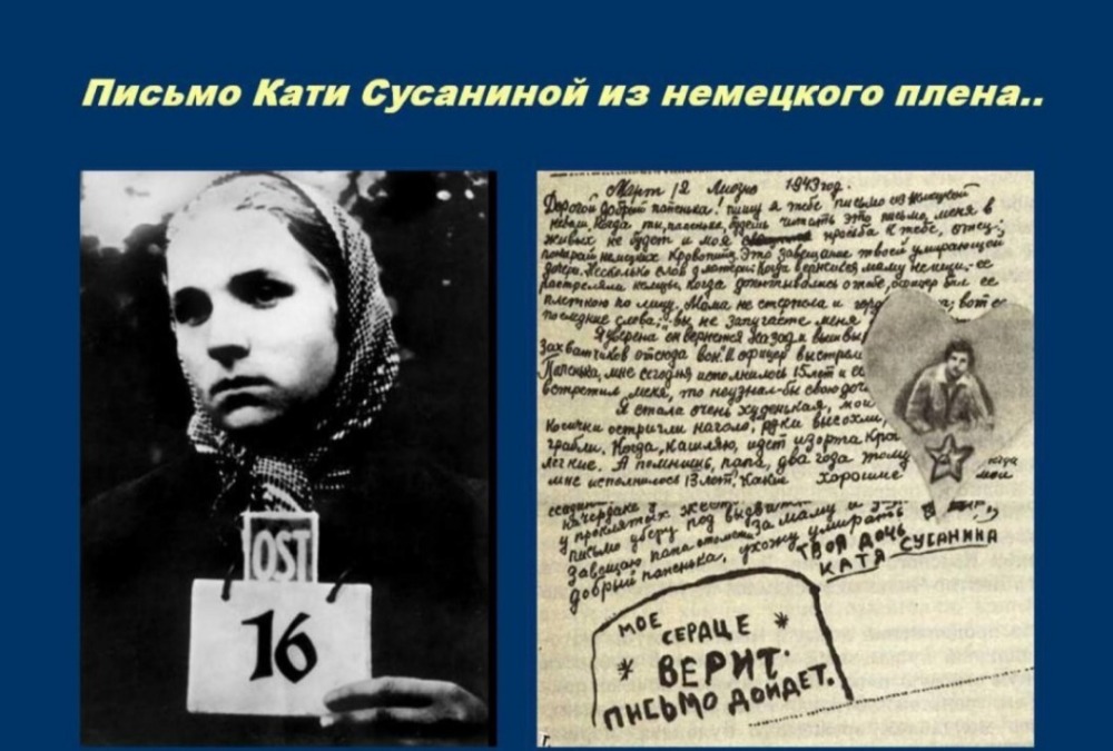В этом году я посещала Красный берег. Я видела там письмо Кати Сусаниной. Оно - очень грустное. Сейчас же, вспоминая это время, мы должны быть благодарными нашим предкам за победу в Великой Отечественной войне и пообещать им, что наша страна будет процветать.