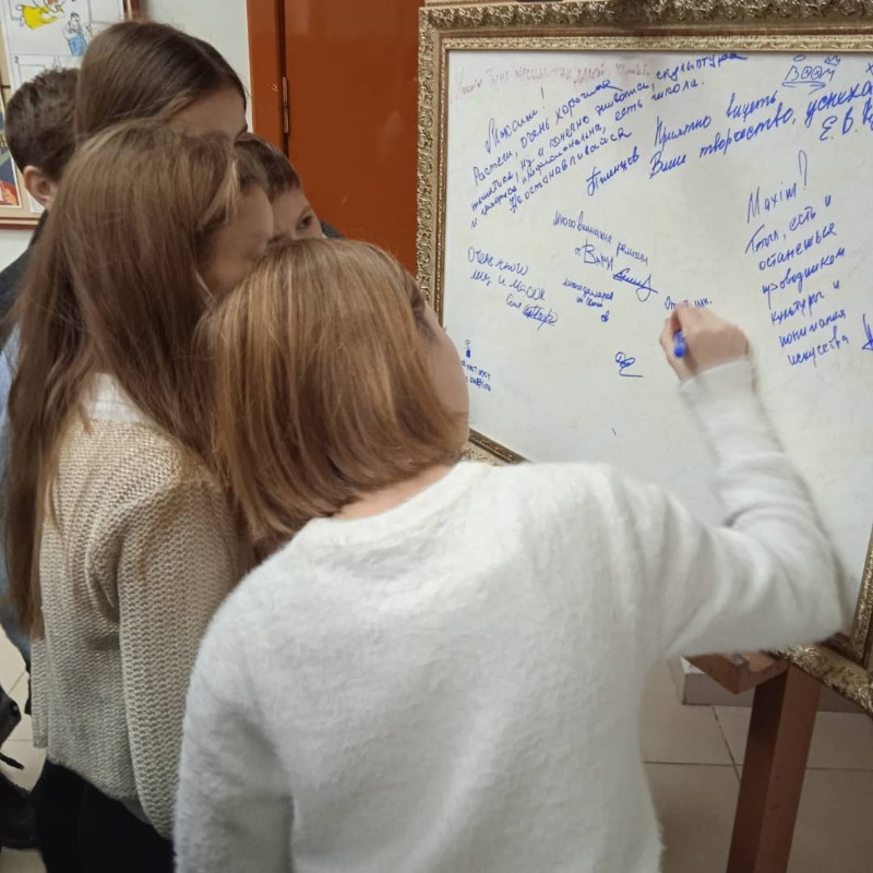 Выставка несла в себе позитивный заряд, имела элементы юмора. Чтобы, даже поразмышляв о двойственности своих поступков, человек уходил с неё, заряженный положительной энергией. В экспозиции представлено порядка 60 работ – скульптура, живопись, графика, инсталляции, в том числе в виде артобъектов. Детям безумно понравились картины, а именно: "Мост", "Яблоко", "Духовное и материальное", "Мир", "Завтрак с маэстро". После нашей экскурсии мы написали благодарность, спасибо за такую чудесную выставку и за то, что насладились такими прекрасными работами, живописью, скульптурой и др.