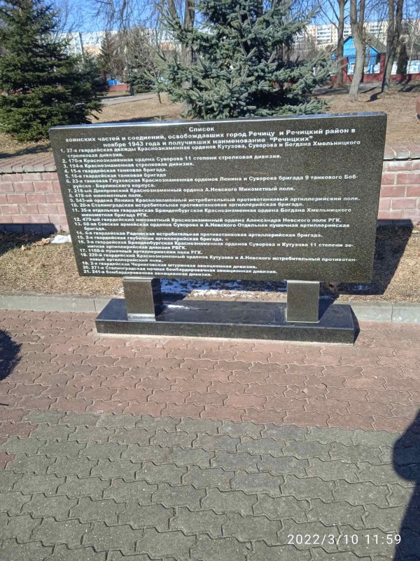 Танк Т-34[88], принимавший участие в боях за освобождение Речицы от немецко-фашистских захватчиков. Установлен 20 ноября 1943 года, в самый разгар Гомельско-Речицкой наступательной операции, на братскую могилу в парке в Речице в память о погибших танкистах 15-й бригады полковника Кошакова. Экипаж танка: командир Михаил Русанов, механик-водитель Анатолий Талалаев, стрелок-радист Иван Смирнов и башенный стрелок Федор Кленков. Примечательно то, что именно этот танк получил повреждение ещё на подступах к городу (один из катков "не родной"), одним из первых ворвался в Речицу, однако экипаж уцелел и продолжил воевать, а боевая машина увековечила подвиг других танкистов, наступавших в направлении главного удара[89]. Это единственный установленный в Республике Беларусь памятник боевой машине, одновременно являющийся подлинным историческим экспонатом для увековеченных событий. Данный танк установлен в парке Победы.